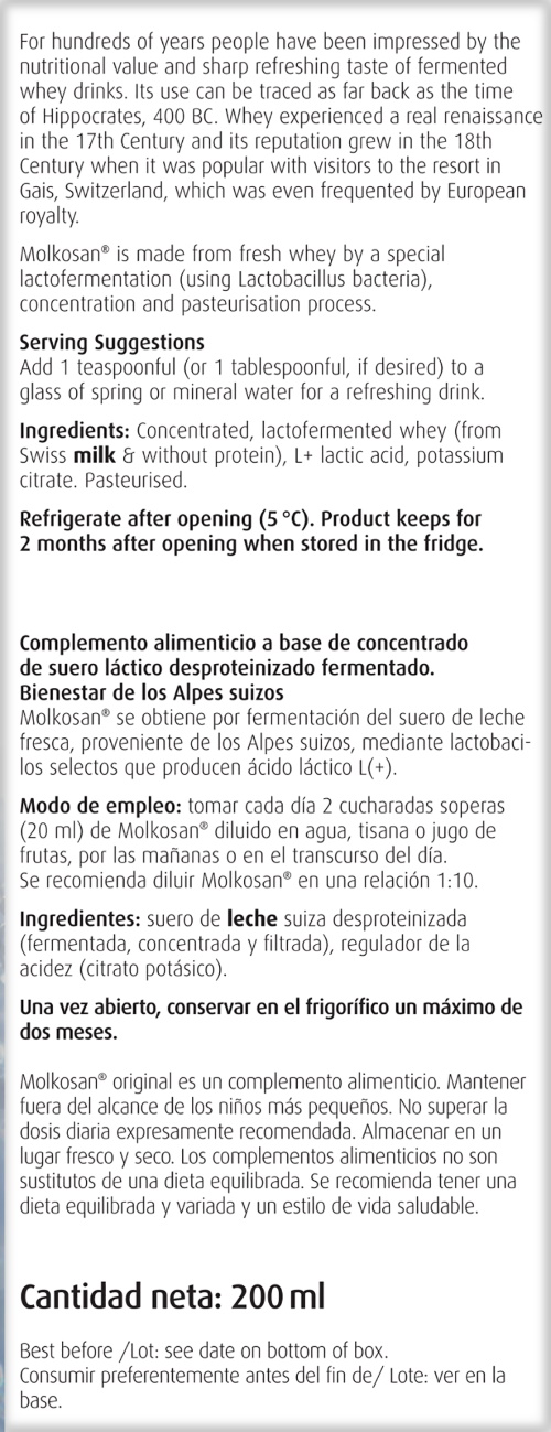 Molkosan® Original is available in 200ml and 500ml bottles. It can be used by adults and children over the age of 2 years.