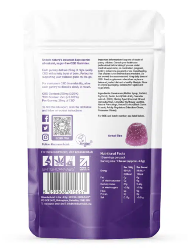 Every pouch of ACCESS CBD® CBD Gummies contains 10 chewy sweets, each delivering 25mg of CBD. To optimise CBD bioavailability, we suggest you savour each gummy slowly before munching. Reseal the pouch to maintain freshness.