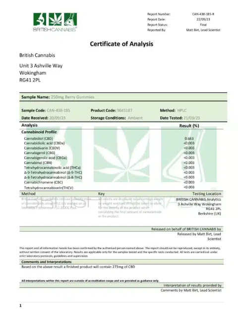 Sweeteners (Maltitol Syrup, Sorbitol, Erythritol), Pectin, Acid (Citric Acid), Cannabis sativa L. (CBD), Glazing Agent (Coconut Oil and Carnauba Wax), Emulsifier (Sunflower Lecithin), Natural Flavourings, Natural Colour (Black Carrot Extract), Acidity Regulators (Trisodium Citrate, Potassium Citrate).
