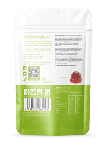 Orange Flavoured Gummy (Orange) Ingredients: Sweeteners (Maltitol Syrup, Sorbitol, Erythritol), Pectin, Acid (Citric Acid), Cannabis sativa L. (CBD), Glazing Agent (Coconut Oil and Carnauba Wax), Emulsifier (Sunflower Lecithin), Natural Flavouring, Natural Colour, Acidity Regulators (Trisodium Citrate, Potassium Citrate).