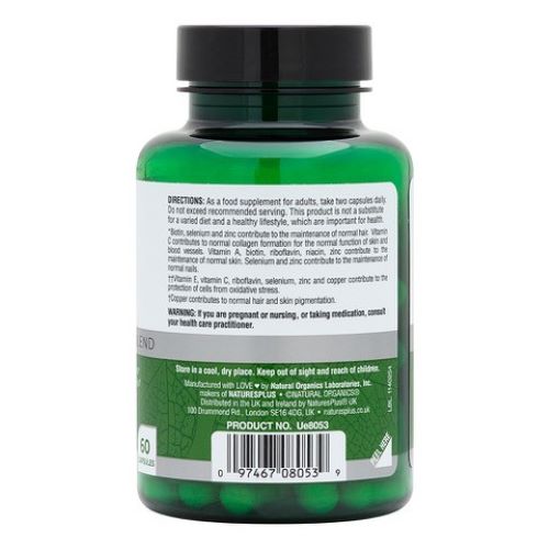 *Biotin, selenium and zinc contribute to the maintenance of normal hair. Vitamin C contributes to normal collagen formation for the normal function of skin and blood vessels. Vitamin A, biotin, riboflavin, niacin, zinc contribute to the maintenance of normal skin. Selenium and zinc contribute to the maintenance of normal nails.