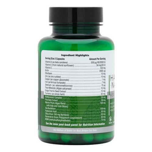 Ingredients: Vitamin A (as beta carotene) (2000 IU); Vitamin E (from sunflower seed oil); Vitamin C (as ascorbyl palmitate, calcium ascorbate, magnesium ascorbate, potassium ascorbate, zinc ascorbate), Riboflavin, Niacin (as nicotinamide), Biotin, Iron (as ferrous fumarate), Zinc (as zinc sulfate, ascorbate), Copper (as copper gluconate), Manganese (as manganese sulfate); Selenium (as selenomethionine); Sea Buckthorn (Hippophae rhamnoides fruit) (rich in Omega 3, Omega 6, Omega 7, Omega 9; Bamboo (Bambusa vulgaris stem) (supplying naturally occurring silica) Marine Phyto Algae Blend; Kelp [Ascophyllum nodosum] (35mg), Irish Moss [Chondrus crispus] (32 mg), Spirulina [Spirulina platensis] (20mg) , Lithothamnion Spp. (5mg), Dulse (Palmaria palmata) (5mg), Laminaria digitata (3mg); Methylsulfonylmethane (MSM), Hyaluronic Acid (as sodium hyaluronate), Resveratrol (from Polygonum cuspidatum root); Pine Bark Extract (Pinus pinaster) (naturally rich in proanthocyanidins) ; Turmeric (Curcuma longa rhizome); Quercertin (Dimorphandra mollis fruit); Grape Fruit & Seed Extract (Vitis vinifera); Sweet Orange Fruit Extract (Citrus sinensis) (naturally occurring bioflavonoids); Trace Mineral Complex (Algas calcareas)