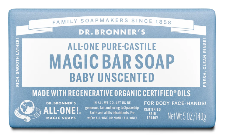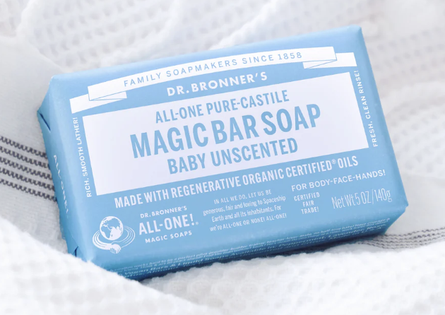 Dr. Bronner’s Pure-Castile Bar Soaps are vegan, gentle and versatile, good for washing body, face or hair! Enjoy only 2 cosmetics, enough sleep & Dr. Bronner’s Magic Soaps to clean-body-mind-soul-spirit instantly uniting One! All-One!! Read Lisa Bronner’s Bar Soaps Dilutions Cheat Sheet.