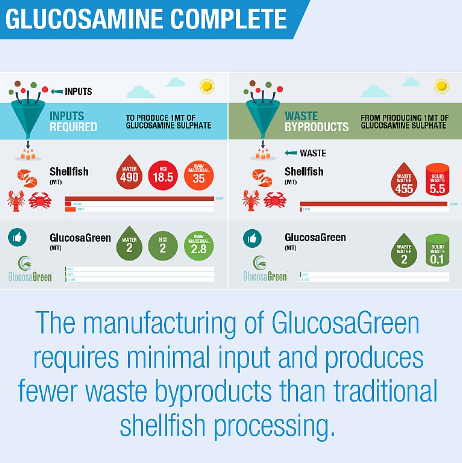 Three tablets provide a full 1400mg of glucosamine sulphate, the level used in many studies. Lamberts Glucosamine Complete utilises GlucosaGreen® – the world’s first commercially available glucosamine produced by a revolutionary direct-fermentation process. Bioequivalent to the glucosamine derived from shellfish, GlucosaGreen® is vegan friendly and provides full supply chain transparency and traceability, addressing the many challenges inherent to chitin-derived shellfish production, such as: