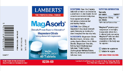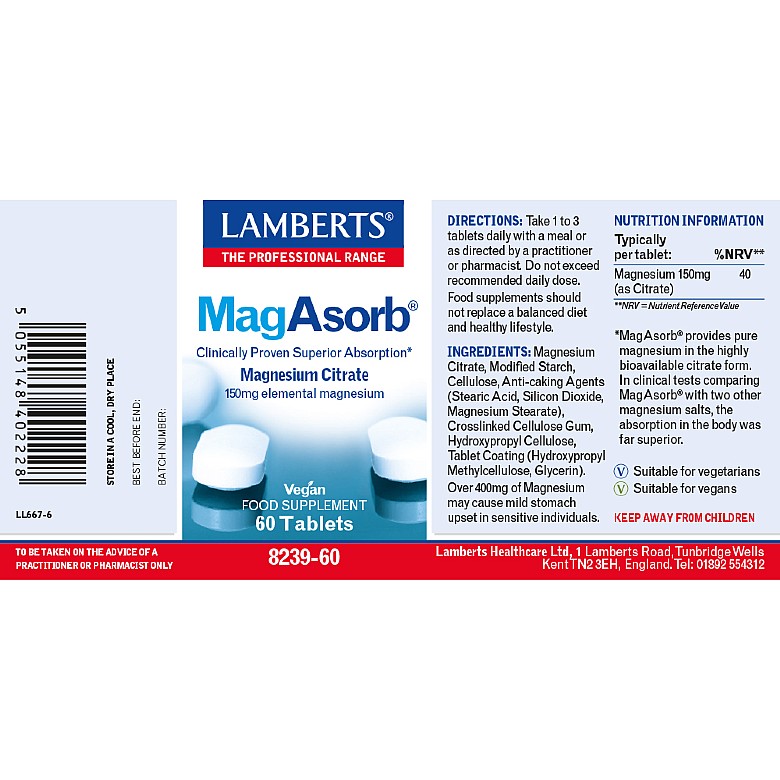 Lamberts® MagAsorb® is now one of the UK’s leading magnesium products, providing 150mg of pure magnesium per tablet. The magnesium in Magasorb®is in the highly bioavailable citrate form. In tests comparing MagAsorb®with two other commonly used magnesium compounds, the absorption of MagAsorb®in the body was superior.