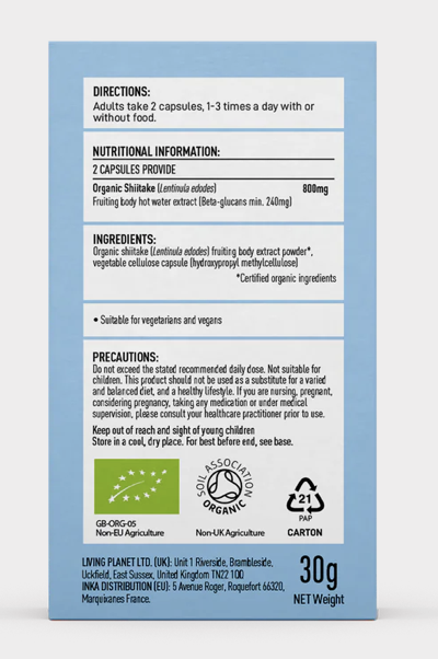 Organic shiitake (Lentinula edodes) fruiting body extract powder*, vegetable cellulose capsule (hydroxypropyl methylcellulose)