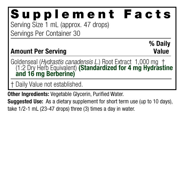 Nature’s Answer® Goldenseal Root extract is unique. One serving of 1 ml supplies 1,000 mg of concentrated Goldenseal extract standardized for 4 mg hydrastine and 16 mg of berberine. Goldenseal supports a healthy immune system*. Alcohol-free, Vegan, Kosher, Non-GMO project verified, no animal testing. From Our Family to Yours since 1972!