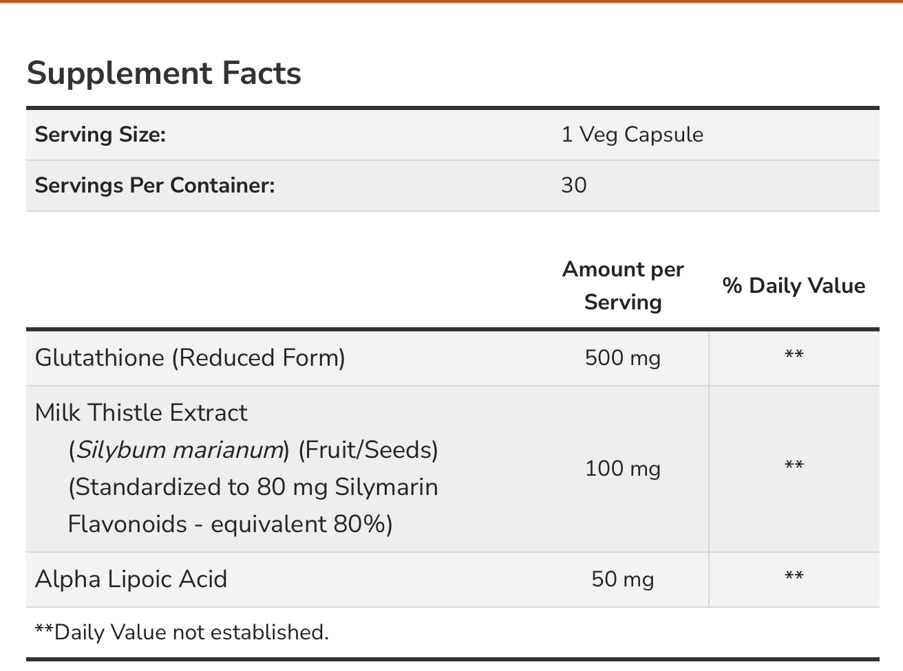 Glutathione is a small peptide molecule composed of three amino acids: cysteine, glutamic acid, and glycine. It is produced by every cell of the body, with especially high levels in the liver.* Glutathione is critical for healthy immune system function, necessary for proper detoxification processes, and supports healthy aging.* It also plays a critical role in maintaining cellular health by directly neutralizing free radicals, as well as by maintaining the activity of vitamins C and E.* Milk thistle extract and alpha lipoic acid are included as complementary ingredients.
