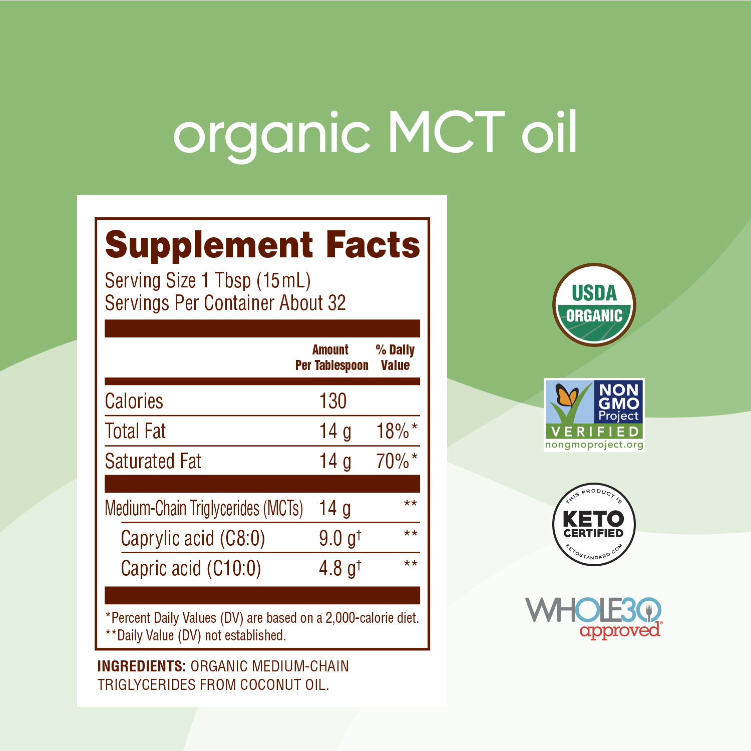 Nutiva Organic MCT Oil is concentrated with the medium-chain triglycerides, capric acid and caprylic acid. Medium-chain triglycerides (MCTs) are easily digested and provide energy, support the metabolism and are burned by the body for energy and fuel. In conjunction with a balanced diet and exercise, consuming MCT Oil can support weight management.