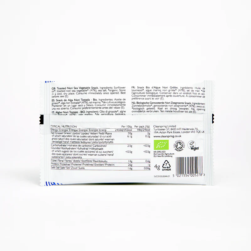 Ingredients: Sunflower oil*, toasted nori sea vegetable* (47%), sea salt. *organically grown.