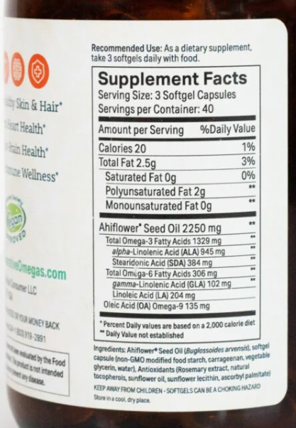Made with Ahiflower® oil, Regenerative Omegas gives you the highest amount of natural, plant-derived omegas compared to any other omega source. Ahiflower oil is a perfectly balanced oil for all-around health, wellness, and vitality. Some oils such as evening primrose focus on just one specific fatty acid.